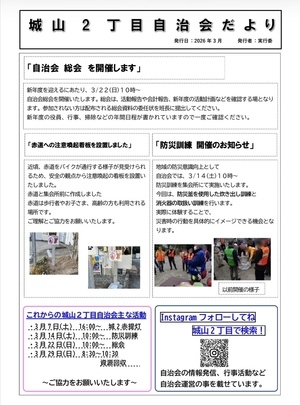 新着情報 2026年3月19日【支えあい】城山2丁目自治会だより3月 ~城山2丁目自治会~2026年3月18日【支えあい】雨が降っても大盛況 ~城山3丁目地区・さくらカフェ~2026年3月9日【支えあい】ちくちくカフェ開催のお知らせ ~着物類をリメイクして災害支援に~2026年3月6日【シニアクラブ】「寒さ関係なし!動いとんであったかいの!」~第55回グラウンドゴルフ大会~2026年3月1日【支えあい】カフェにしよんたより 第76号 ~笹尾西4丁目地区・カフェにしよん~2026年3月1日【支えあい】健遊会だより 第23号 ~笹尾西4丁目地区・健遊会~2026年2月28日【支えあい】各地区の支えあい活動 3月