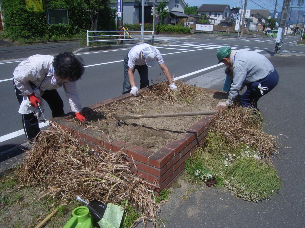 花植えは、集会所周り及びプランターと東西方向バス通りにある3か所(酒天童子前・美容院前・駐車場前)の2班に分かれて行いました。花壇等の整備(草取り)を行い、10時に子ども会8名の参加者が集合したところで、花植えに参加してもらいました♪