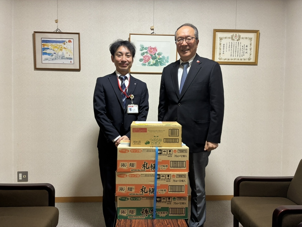 令和7年12月9日(火)、東員笹尾郵便局様より、缶飲料とカップ麺のご寄付をいただきました。
